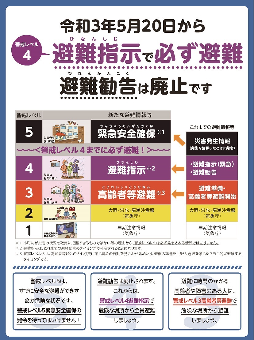 - 避難のタイミングを明確にするため、避難勧告を廃止し、警戒レベル4を「避難指示」に一本化。