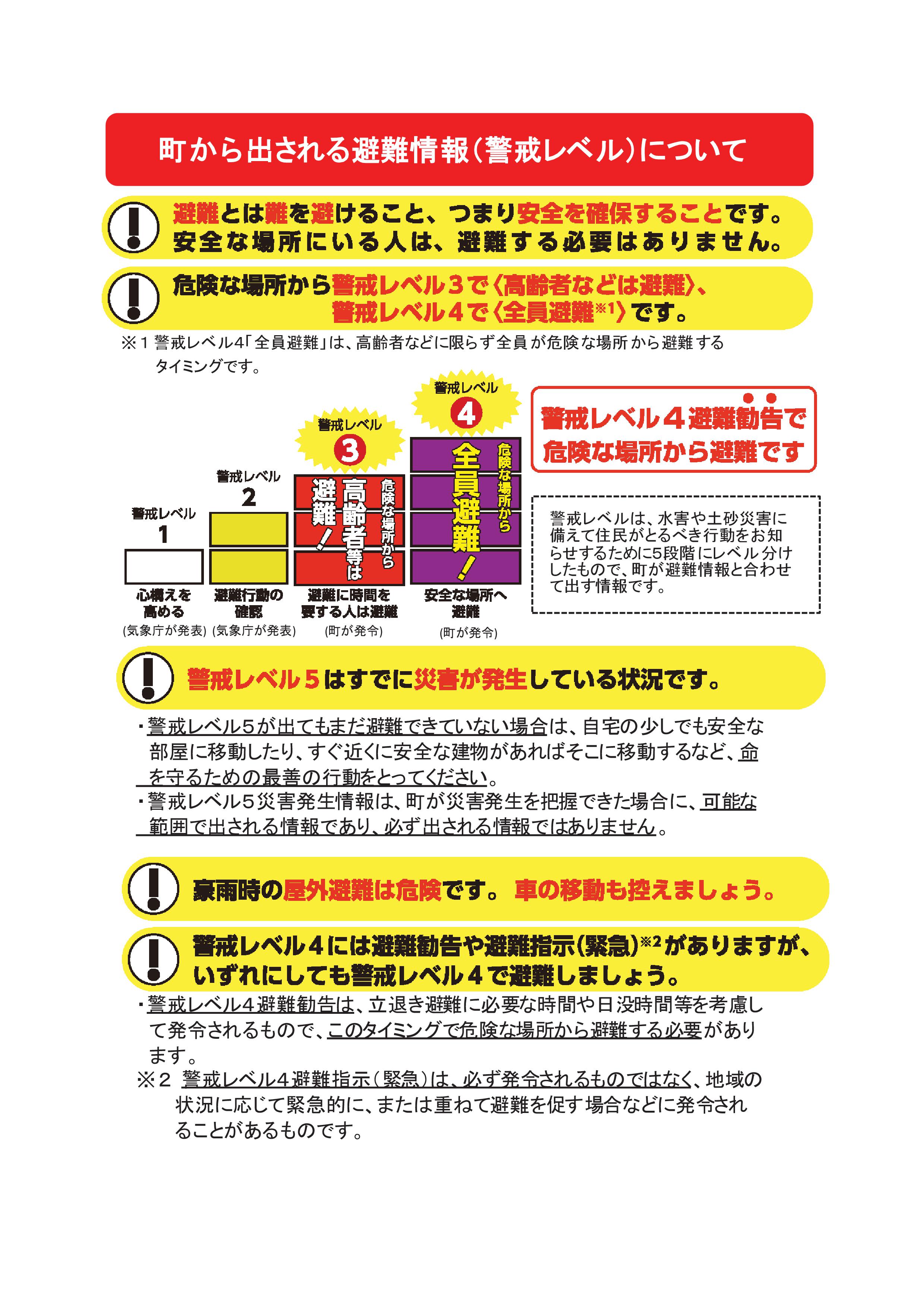 記事番号: 1-1665 公開日 2022年04月11日 避難行動判定フロー(PDF文書/210KB) 町から出される避難情報(警戒レベル)について(PDF文書/260KB) この記事に関するお問い合わせ 総務課住所:青森県上北郡六戸町大字犬落瀬字前谷地60TEL:0176-55-3111FAX:0176-55-3112