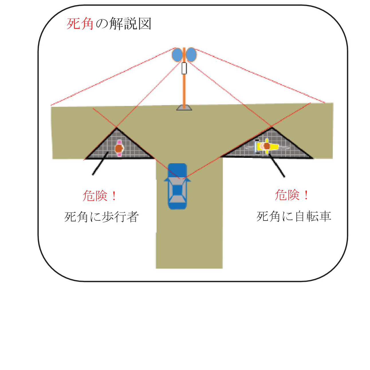 ① カーブミラーで映せない部分(死角)があり、死角から出てくる自転車や歩行者の発見が遅れることがある。