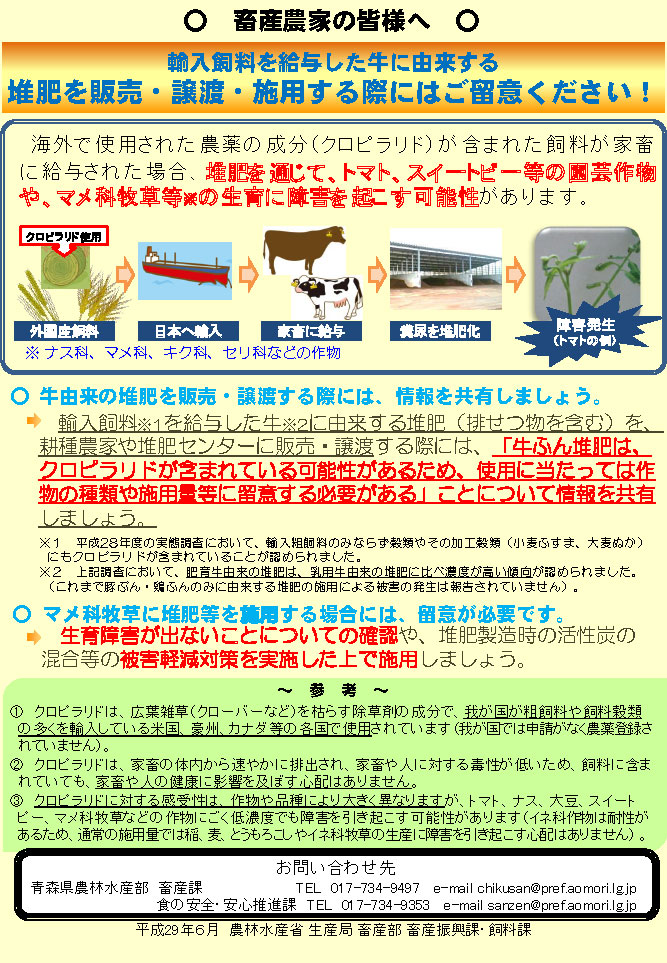 ア 牛由来堆肥の提供先と、「牛には、一般に輸入飼料が給与されているため、牛由来堆肥にはクロピラリドが含まれている可能性があり、特に肥育牛の排せつ物を多く含む堆肥には、高い濃度でクロピラリドが含まれている可能性がある。このため、園芸作物等への使用に当たっては作物の種類や施用量に留意し、場合によっては使用を控える必要がある。」旨の情報を確実に共有すること。特に、トマト、スイートピー等、クロピラリドによる生育障害が発生しやすい作物で、堆肥の利用を予定する園芸農家・育苗業者等との間では、確実にこの情報を共有するものとする。
